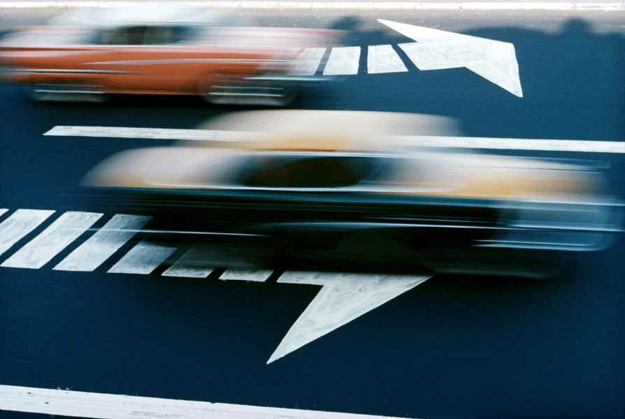 In the image above, Traffic, NY, we can see many of the hallmarks of Haas and, more broadly, street photography. Haas captures two cars speeding past on the streets of New York. Images often include leading lines to draw the viewer’s gaze to a particular spot or in a set direction. The leading lines of the white arrows stand out and match the direction of the speeding cars perfectly. Framing the shot to include the arrows and achieving the right amount of blur to keep the moving cars in shot would have required a precise attention to shutter speed.