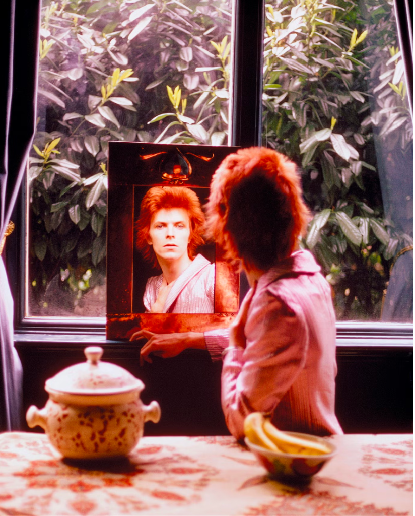 In the image below, we see a good example of how Rock captures the whimsical side of Ziggy Stardust, where his reflection faces the camera via a mirror. Interestingly, in the same decade (1977), Sontag published her groundbreaking book ‘On Photography’ where she compares photography to Plato’s allegory of the cave, suggesting that photographs, like shadows, can overtake and supersede reality. In the 1970s, Bowie himself loved to court pretension and adopt roles where the viewer always saw him through the lens of one of his fictional characters.