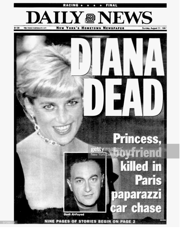 The term ‘Paparazzi’ came into common currency and was synonymous with the type of photographer that would go to any lengths to get the right image. The ethical issues we discussed in the 1960s section are even more relevant here because the Paparazzi were often seen to be out of control with no respect for a subject’s privacy. The image below recounts the death of Princess Diana, a case in point here. Some people believe the car accident that resulted in her death in 1997 was directly caused by her trying to escape overzealous Paparazzi (Smith, 2018).
