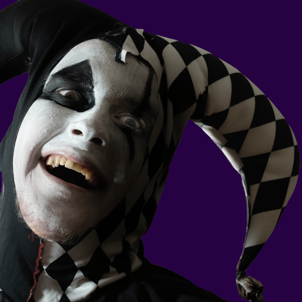 What impact does filling this image with positive space have on the viewer? Firstly, it has the effect of bringing the clown closer to you, so it feels like he is invading your personal space. This certainly adds to the menacing aspect of the image.