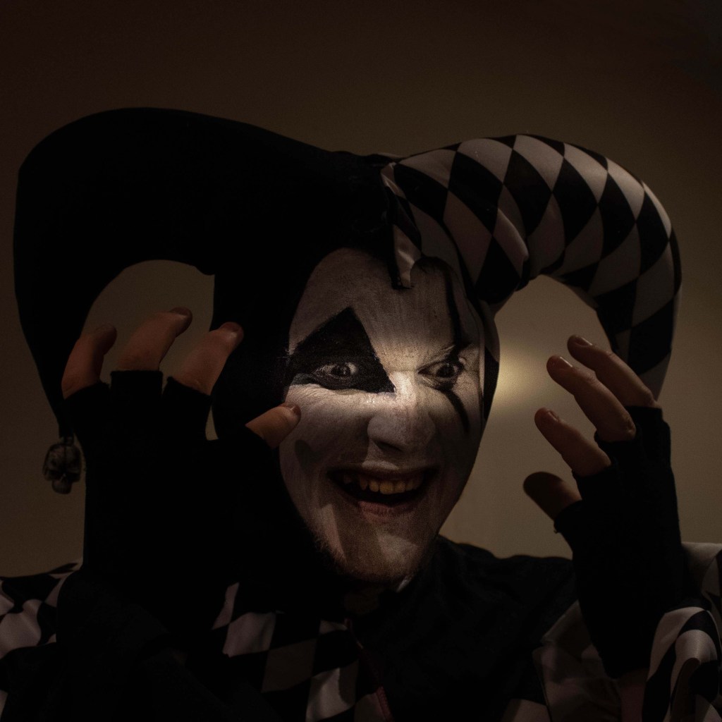 For this image, I used a fixed 50mm lens, which allowed me to focus sharply on the end of the cane while distorting the clown wielding it (Aperture 1.8). Not being able to see the clown clearly makes him more sinister, especially as the split lighting created by the softbox is far more pronounced in this image.