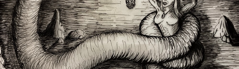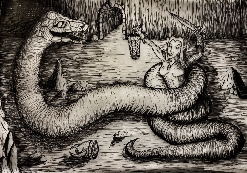 Rather than straight lines, contour hatching follows the required shape of the object or thing you are shading. In this case, I’ve used contour hatching on the giant snake. The snake is tubular in dimensions, so using the lines to follow the curvature of the snake’s body helps to create depth.