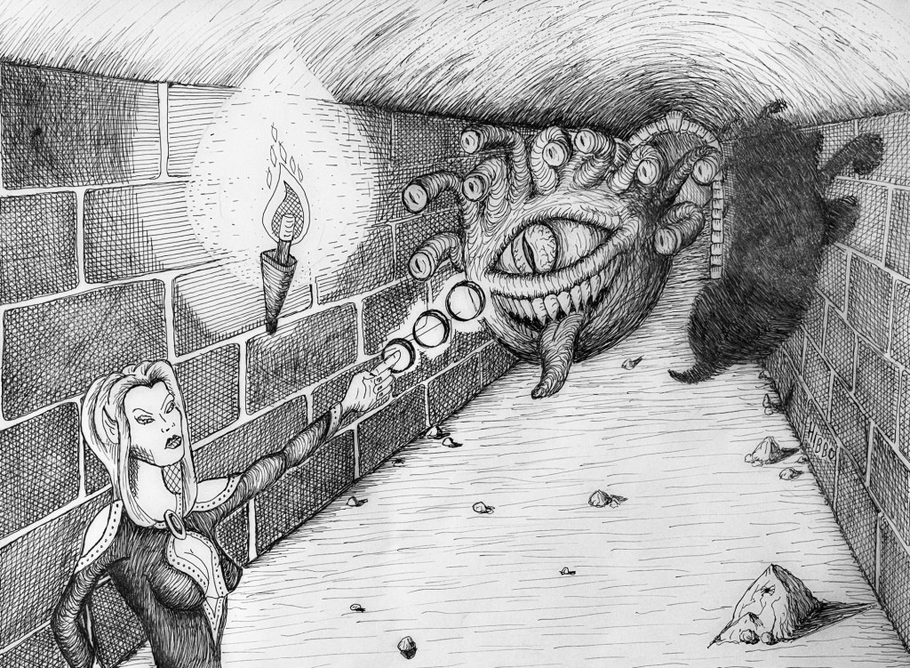 In the image above the light source is a simple torch flickering on the wall. I’ve deliberately placed it there because it allows me to create a menacing shadow behind the beholder, that makes the monster even more menacing.