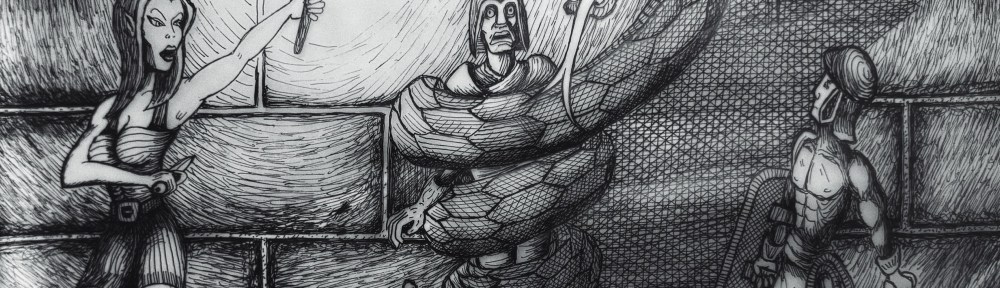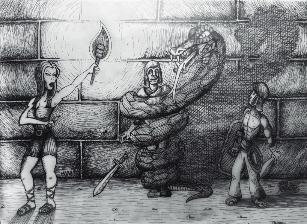 Recently, I finished the piece below involving a group of explorers under attack from a giant snake.